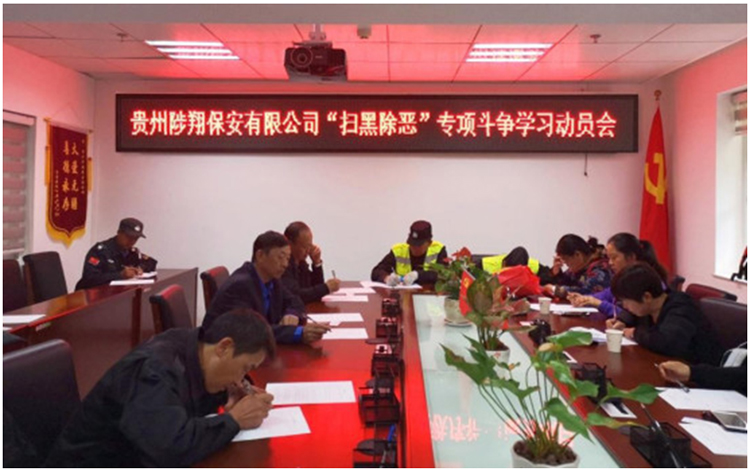 2019 年 4 月 8 日,貴州陟翔保安有限公司召集各區(qū)域經(jīng)理、項目經(jīng)理、項目隊長在公司會議室召開了“掃黑除惡” 專項斗爭學(xué)習(xí)動員大會。會議由公司總經(jīng)理陳春生主持,會上傳達(dá)學(xué)習(xí)了貴陽市公安局治安支隊保安服務(wù)管理大隊下發(fā)的《關(guān)于保安服務(wù)行業(yè)積極協(xié)助公安機(jī)關(guān)開展掃黑除惡專項斗爭和加強(qiáng)隊伍建設(shè)工作的通知》及《掃黑除惡應(yīng)知應(yīng)會》 知識,并就貫徹落實《通知》精神作周密的部署:一是要確實學(xué)懂弄通掃黑除惡專項斗爭的重大意義,從思想上高度重視;二是熟悉《掃黑除惡應(yīng)知應(yīng)會》知識,從行動上積極主動配合公安機(jī)關(guān)行動;三是認(rèn)真仔細(xì)開展排查清理保安員隊伍,對不適宜從事保安工作的人員迅速作清退處理,保持隊伍的純潔性;四是要將《通知》精神傳達(dá)到每個隊員,密切關(guān)注在職隊員的現(xiàn)實表現(xiàn),進(jìn)行動態(tài)管理,加強(qiáng)思想教育,及時制止不良苗頭;五是要規(guī)范隊員入職政審工作,嚴(yán)格按《保安服務(wù)管理條例》規(guī)定辦理入職手續(xù)。