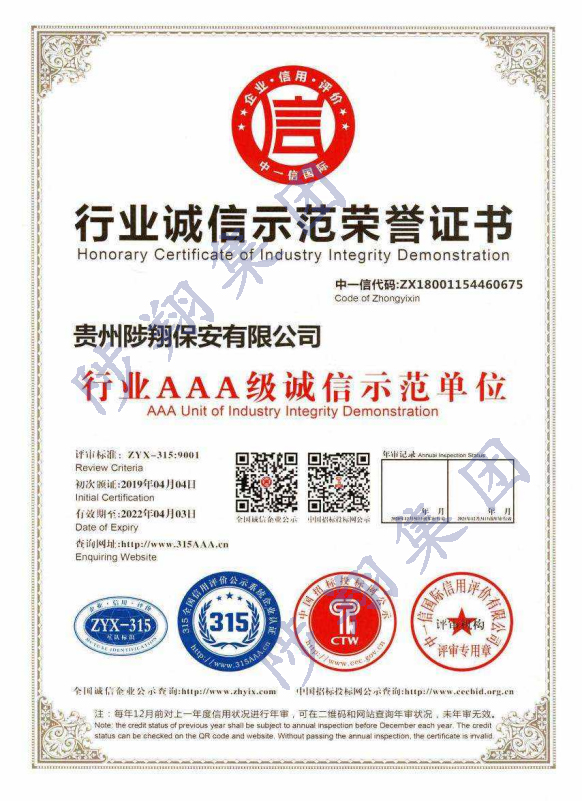 行業(yè)誠信示范榮譽證書